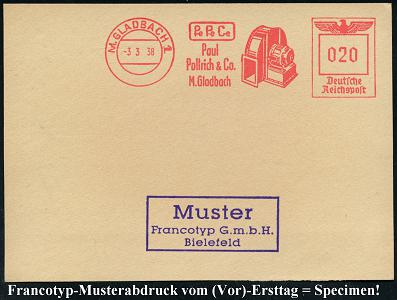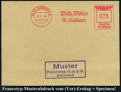 6738 | 35 € | 4050 Mönchengladbach : M.GLADBACH 1/ Wilh.Möller.. 1938 (19.11.) AFS-Musterabdruck Francotyp "Reichsadler" , glasklar gest. Francotyp-Musterblatt vom (Vor)-Ersttag !, selten! (Dü.E-5CGo) | ![]() ![]() | |