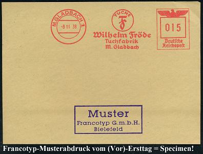 6737 | 35 € | 4050 Mönchengladbach : M.GLADBACH 1/ TUCHE/ F/ Wilhelm Fröde/ Tuchfabrik.. 1938 (8.11.) AFS-Musterabdruck Francotyp "Reichsadler" (Monogr.-Logo) glasklar gest. Francotyp-Musterblatt vom (Vor)-Ersttag !, selten! (Dü.E-5CGo) | ![]() ![]() | |