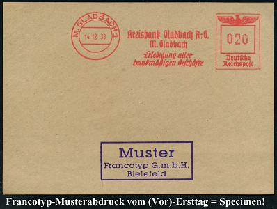 6739 | 35 € | 4050 Mönchengladbach : M.GLADBACH 1/ Kreisbank Gladbach../ Erledigung aller/ bankmäßigen Geschäfte 1938 (14.12.) AFS-Musterabdruck Francotyp "Reichsadler" , glasklar gest. Francotyp-Musterblatt vom (Vor)-Ersttag!, selten! (Dü.E-5CGo) | ![]() ![]() | |
