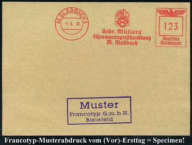 6740 | 35 € | 4050 Mönchengladbach : M.GLADBACH 1/ Gebr.Müllers/ Eisenwarengroßhandlung.. 1939 (1.6.) AFS-Musterabdruck Francotyp "Reichsadler" (Monogr.-Logo) glasklar gest. Francotyp-Musterblatt vom (Vor)-Ersttag!, selten!, vergl. Kat.-Nr. 6791 (Dü.E-5CGo) | ![]() ![]() | |