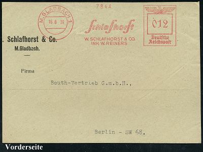 6743 | 14 € | 4050 Mönchengladbach : M.GLADBACH 1/ Schlafhorst/ W.SCHLAFHORST & CO/ INH.W.REINERS 1939 (16.8.) AFS Francotyp "Reichsadler" klar auf Firmen-Vorderseite (Dü.E-5CEh) | ![]() | |