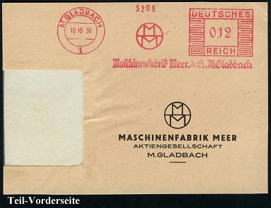 6744 | 14 € | 4050 Mönchengladbach : MGLADBACH/ 1/ MM/ Maschinenfabrik Meer AG.. 1939 (10.10.) AFS Francotyp "Mäanderrechteck" (Monogr.-Logo) motivgl. Firmen-Teil-Vorderseite (Dü.E-2CEh) | ![]() | |