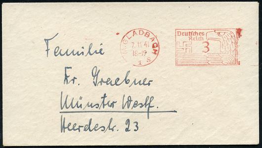 6745 | 18 € | 4050 Mönchengladbach : M.GLADBCH/ 1 s/ Deutsches/ Reich 1941 (7.11.) PFS "Hakenkreuz/ Adlerkopf" 3 Pf. auf dekorativem kleinen Fern-Bf. (Dü.D-6) | ![]() | |