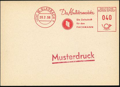 6750 | 25 € | 4050 Mönchengladbach : (22a) M.GLADBACH 1/ Der Konditormeister/ Die Zeitschrift/ für d./ FACHMANN 1958 (20.2.) AFS Francotyp "Posthorn" (3 Bäcker-Köpfe mit Mützen) + 1L: Musterdruck, klar gest. seltene Francotyp-Archiv-Mustekarte! (Dü.E-23CO) | ![]() | |