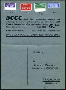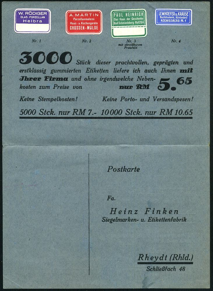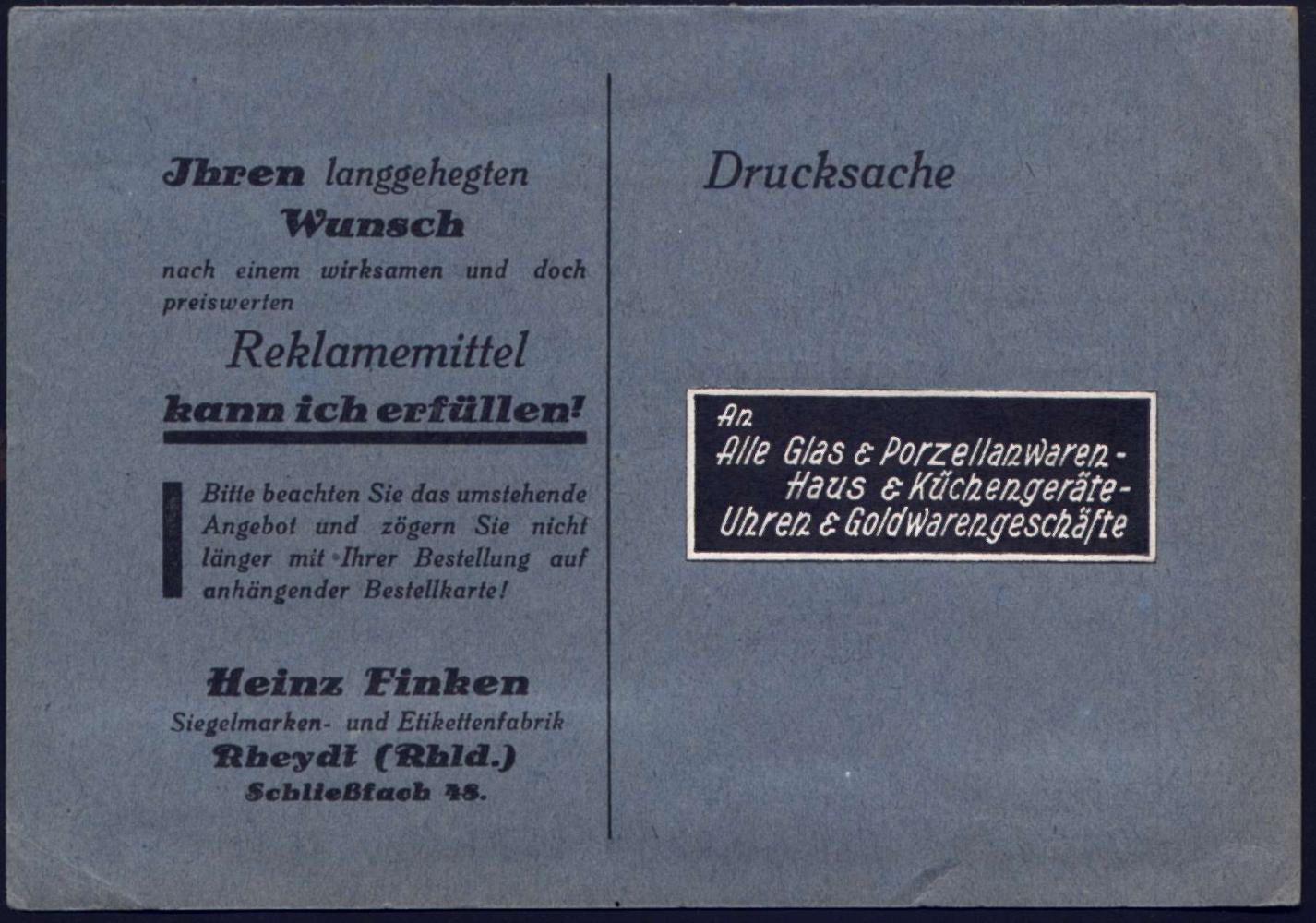 6766 | 30 € | 4070 Rheydt : Rheydt 1930 (ca.) Postwurfsendung mit schw. Label: An Alle Glas & Porzellanwaren-/ Haus & Küchengeräte-/Uhren & Gold-warengeschäfte , Reklame-Klappkt. mit 4 originalen farbigen Klebe-Etiketten (rs. Antwort-Kt.!) komplett,, seltene Form Postwurfsendung mit Label! | ![]() ![]() | |