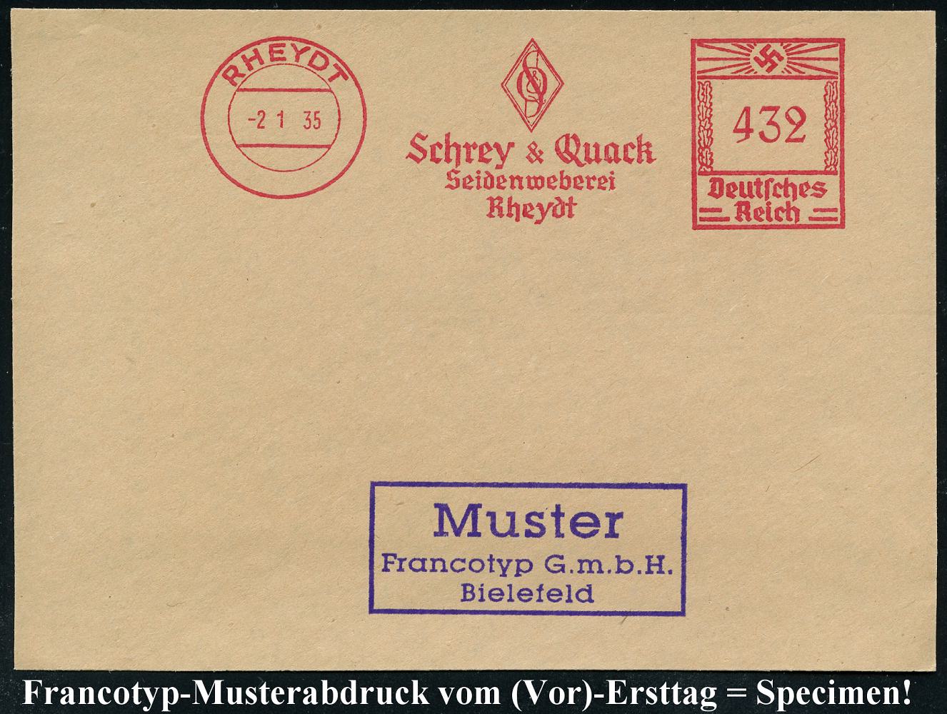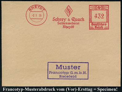 6770 | 35 € | 4070 Rheydt : RHEYDT/ Schrey & Quack/ Seidenweberei.. 1935 (2.1.) AFS-Musterabdruck Francotyp "Hakenkreuz" (Firmen-Logo) glasklar gest. Francotyp-Musterblatt vom (Vor)-Ersttag !, selten! (Dü.E-3CEo) | ![]() ![]() | |