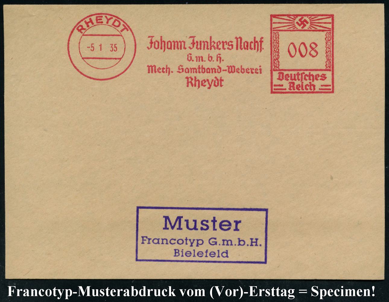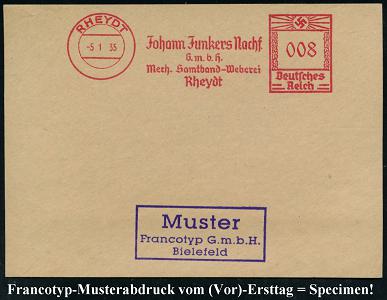 6771 | 35 € | 4070 Rheydt : RHEYDT/ Johann Junkers Nachf./ GmbH/ Mech.Samtband-Weberei.. 1935 (5.1.) AFS-Musterabdruck Francotyp "Hakenkreuz" , glasklar gest. Francotyp-Musterblatt vom (Vor)-Ersttag !, selten! (Dü.E-3CEo) | ![]() ![]() | |