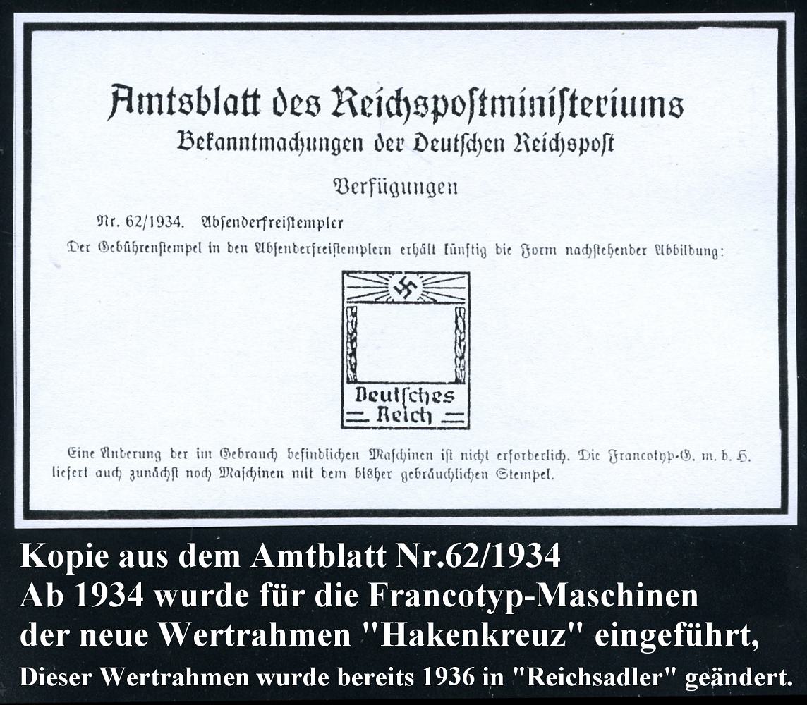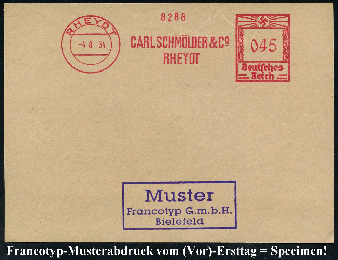 6768 | 35 € | 4070 Rheydt : RHEYDT/ CARL SCHMÖLDER & Co... 1934 (4.8.) AFS-Musterabdruck Francotyp "Hakenkreuz" , glasklar gest. Francotyp-Musterabdruck vom (Vor)-Ersttag !, selten! (Dü.E-3CEh) | ![]() ![]() | |