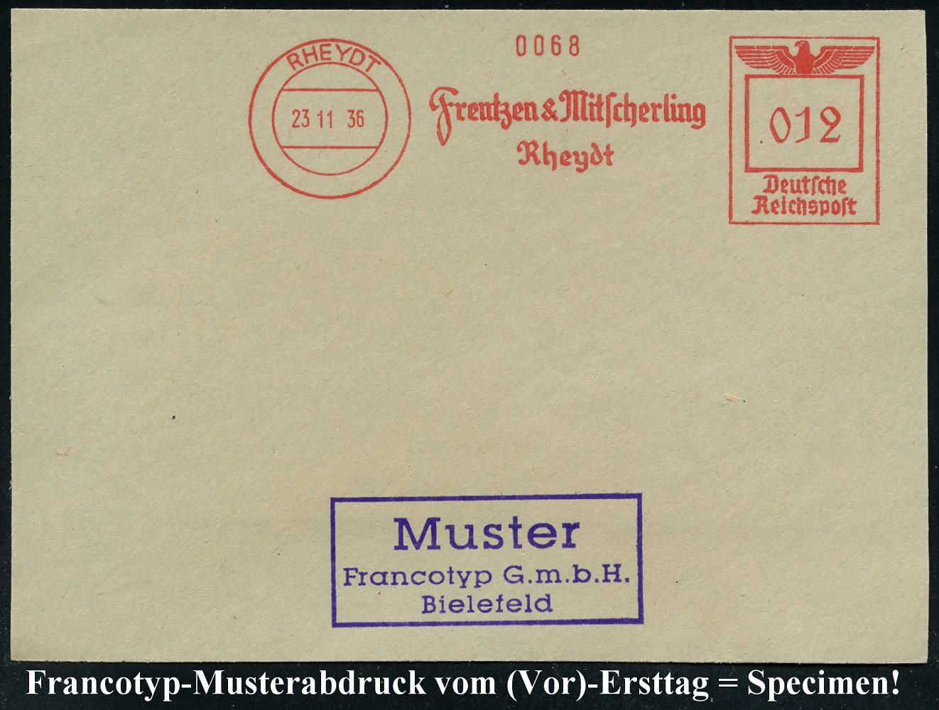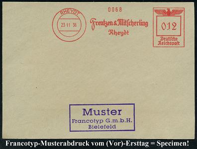 6775 | 35 € | 4070 Rheydt : RHEYDT/ Frentzen & Mitscherling.. 1936 (23.11.) AFS-Musterabdruck Francotyp "Reichsadler" , glasklar gest. Francotyp-Musterblatt vo (Vor)-Ersttag!, selten! (Dü.E-5CEh) | ![]() ![]() | |
