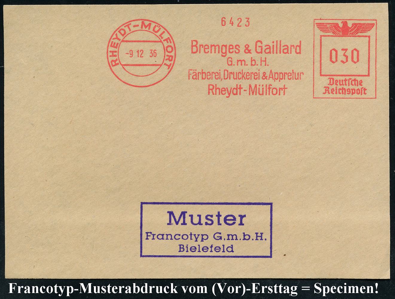 6776 | 35 € | 4070 Rheydt : RHEYDT-MÜLFORT/ Bremges 6 Gaillard/ GmbH/ Färberei,Druckerei & Appretur.. 1936 (9.12.) AFS-Musterabdruck Francotyp "Reichsadler" , glasklar gest. Francotyp-Musterblatt vom (Vor)-Ersttag !, selten! (Dü.E-5CGh) | ![]() ![]() | |