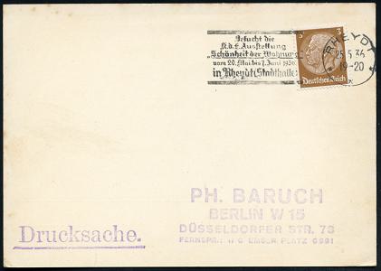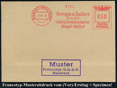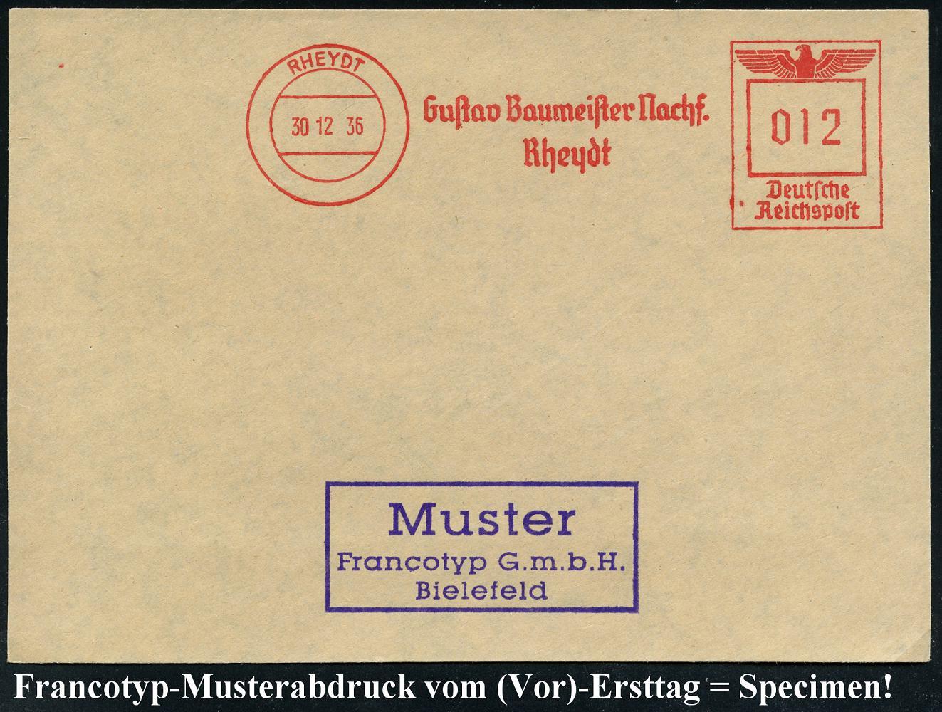 6777 | 35 € | 4070 Rheydt : RHEYDT/ Gustav Baumeister Nachf.. 1936 (30.12.) AFS-Musterabdruck Francotyp "Reichsadler" , glasklar gest. Francotyp-Musterabdruck vom (Vor)-Ersttag !, selten! (Dü.E-5CGo) | ![]() ![]() | |