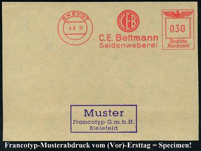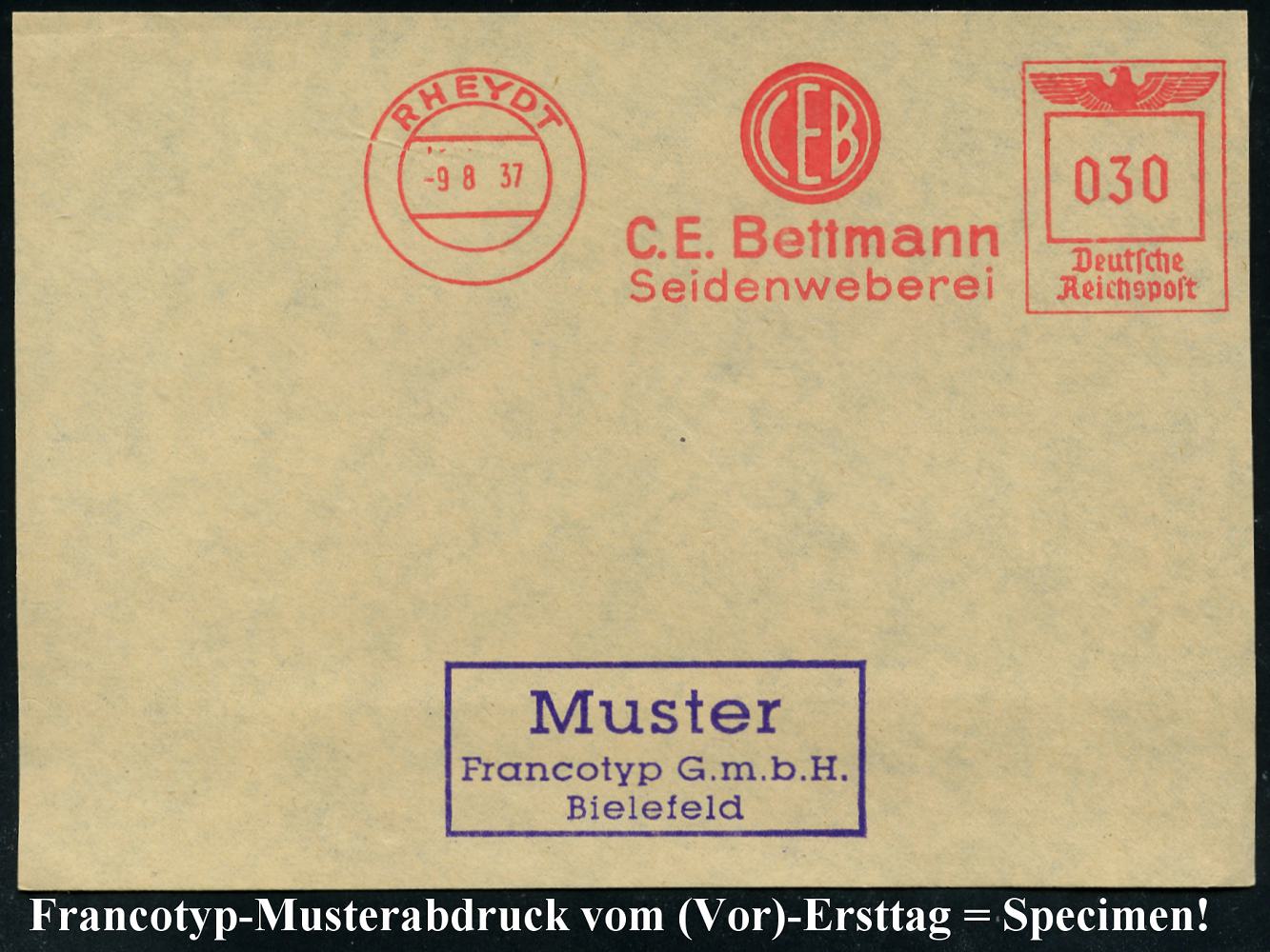 6781 | 35 € | 4070 Rheydt : RHEYDT/ CEB/ C.E.Bettmann/ Seidenweberei 1937 (9.8.) AFS-Musterabdruck Francotyp "Reichsadler" (Monogr.-Logo) glasklar gest. Francotyp-Musterblatt vom (Vor)-Ersttag !, selten! (Dü.E-5CGo) | ![]() ![]() | |