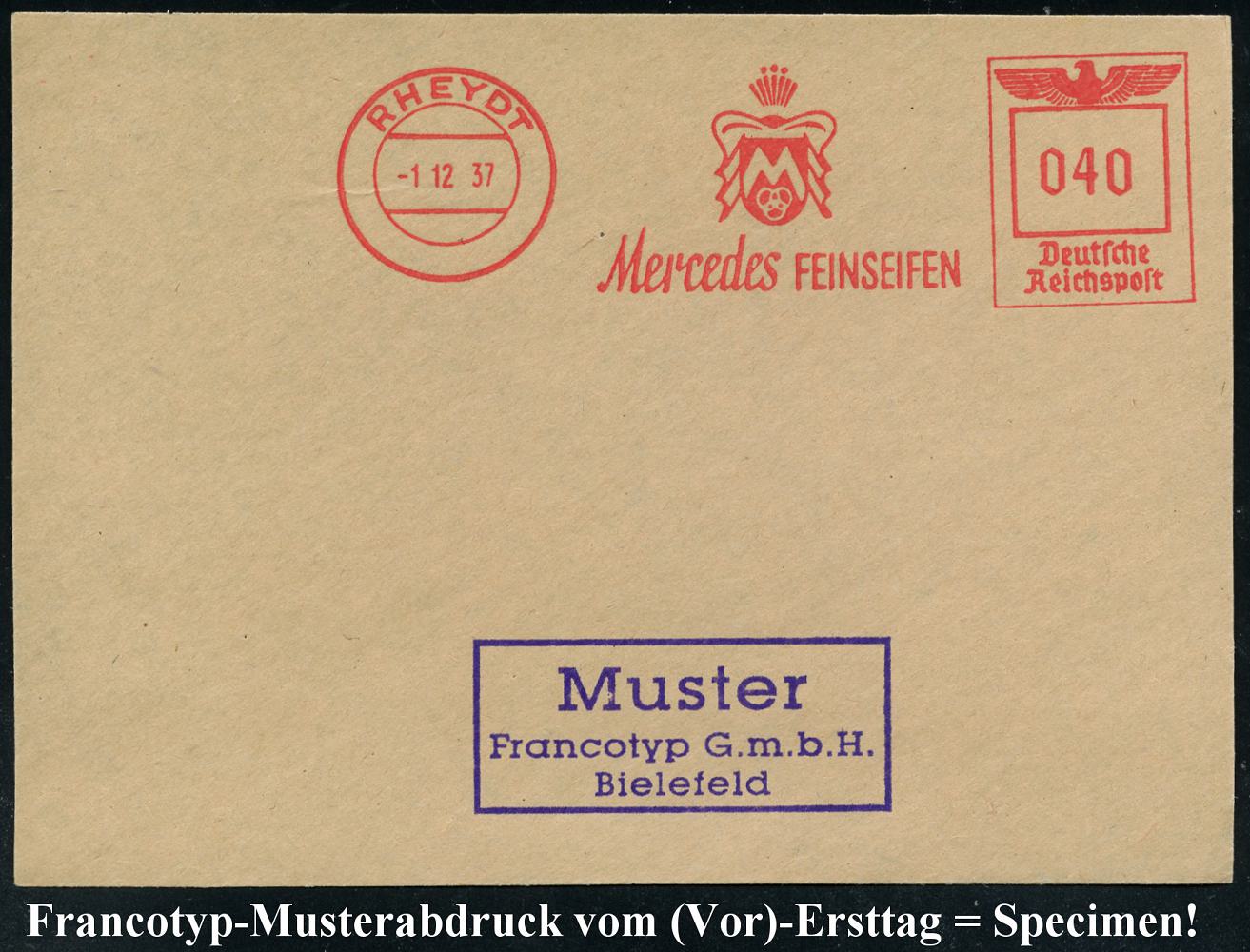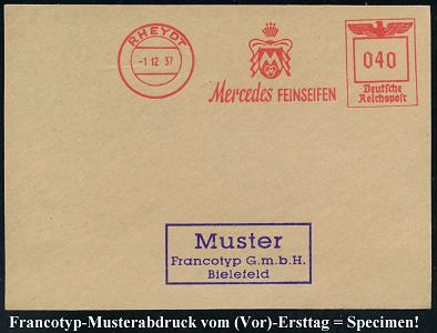 6782 | 35 € | 4070 Rheydt : RHEYDT/ Mercedes FEINSEIFEN 1937 (1.12.) AFS-Musterabdruck Francotyp "Reichsadler" (Monogr.-Logo) glasklar gest. Francotyp-Musterblatt vom (Vor)-Ersttag !, selten! (Dü.E-5CGo) | ![]() ![]() | |