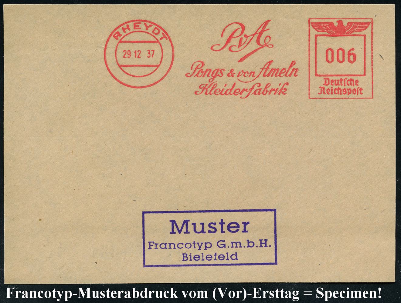 6784 | 35 € | 4070 Rheydt : RHEYDT/ Pongs & von Ameln/ Kleiderfabrik 1937 (29.12.) AFS-Musterabdruck Francotyp "Reichsadler" (Schriftzug) glasklar gest. Francotyp-Musterblatt vom (Vor)-Ersttag !, selten! (Dü.E-5CGo) | ![]() ![]() | |