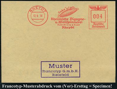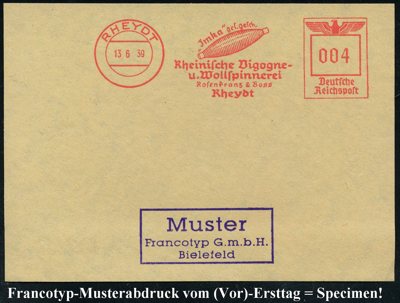 6790 | 35 € | 4070 Rheydt : RHEYDT/ "Jmka" ges.gesch./ Rheinische Vigogne-/ u.Wollspinnerei/ Rosenkranz & Boss.. 1939 (13.6.) AFS-Musterabdruck Francotyp "Reichsadler" (Garn-Rolle) glasklar gest. Francotyp-Musterblatt vom (Vor)-Ersttag !, selten! (Dü.E-5CGo) | ![]() ![]() | |