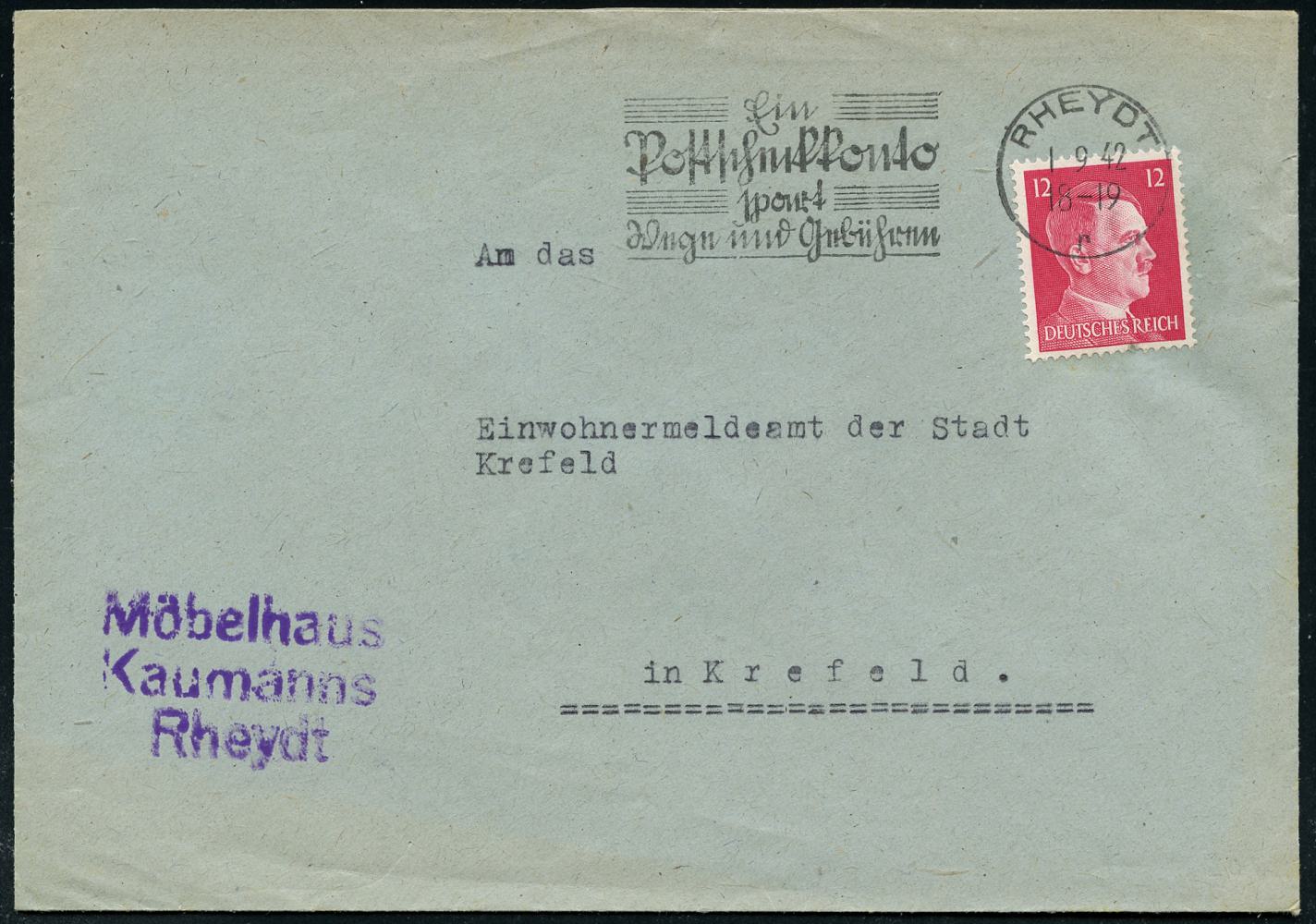 6793 | 16 € | 4070 Rheydt : RHEYDT/ r/ Ein/ Postscheckkonto/ spart/ Wege u.Gebühren 1942 (1.9.) Serien-MWSt, Text in Sütterlin + viol. Abs.-3L: Möbelhaus Kaumanns.., Fern-Bf. (Bo.S 208 A) | ![]() | |