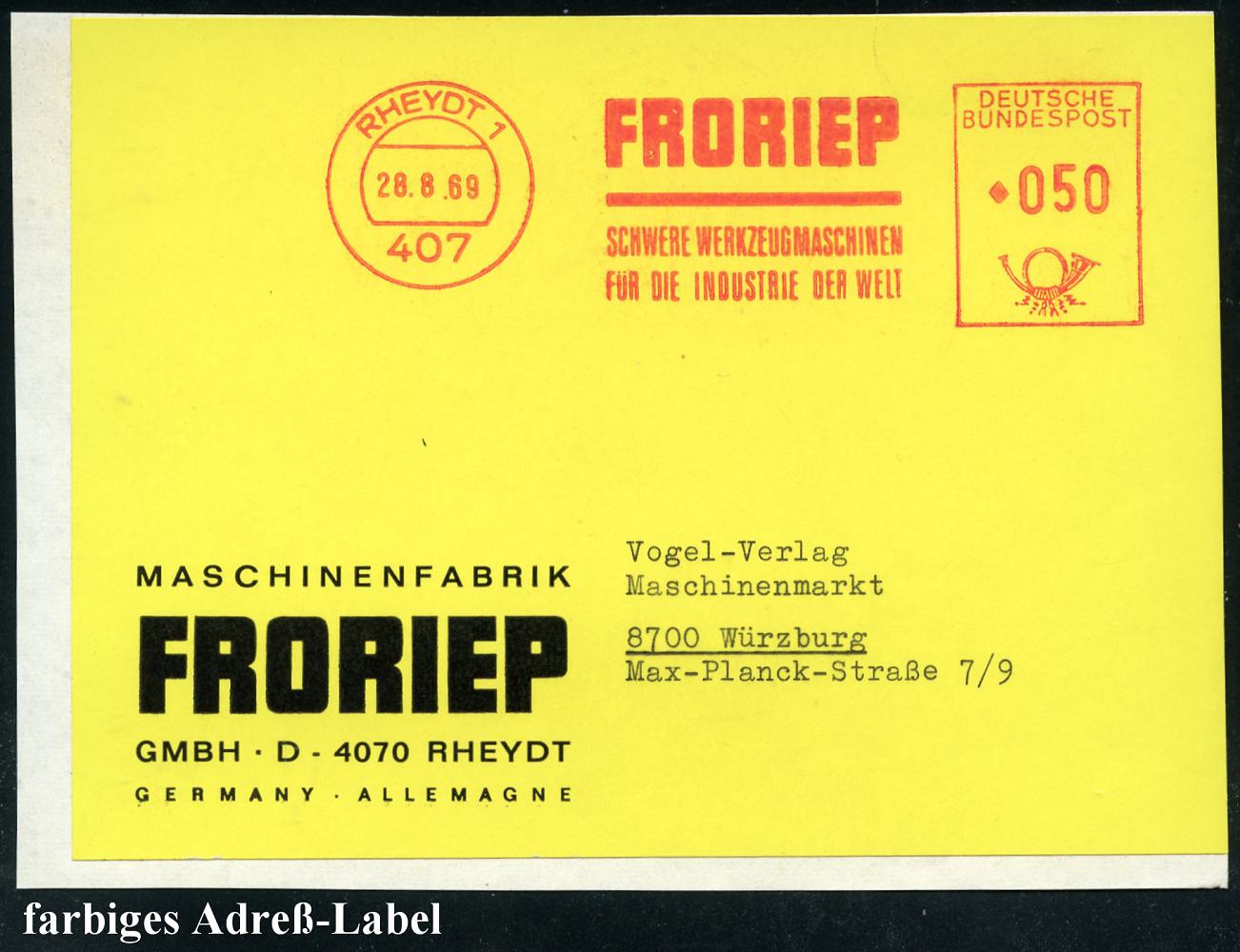 6797 | 16 € | 4070 Rheydt : 407 RHEYDT 1/ FRORIEP/ SCHWERE WERKZEUGMASCHINEN.. 1969 (28.8.) AFS Francotyp 050 Pf. , gelbes Firmen-Label: MASCHINENFABRIK FRORIEP.., seltenes Porto!= 2. Gew.-Stufe "Brief" (Dü.E-23CO mit Raute) | ![]() | |