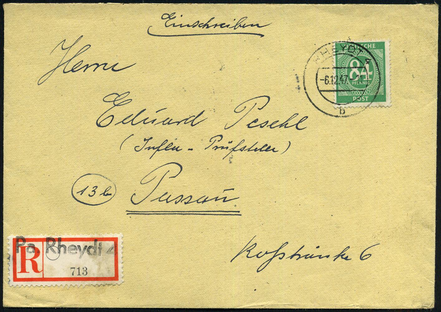 6794 | 14 € | 4070 Rheydt : RHEYDT 4/ b 1947 (6.12.) 2K-Steg auf EF 84 Pf. Ziffer + provis. RZ: Pa. Rheydt 4 = schw. 1L auf Blanco-RZ , Fern-R-Bf. n. Passau, rs. AS (Mi.936 EF + 8.- EUR) | ![]() | |