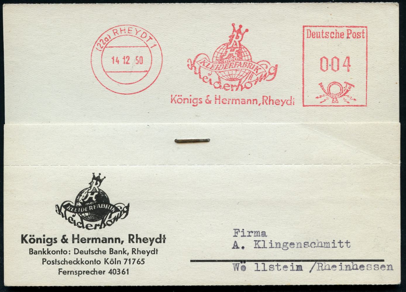 6795 | 16 € | 4070 Rheydt : (22a) RHEYDT 1/ mech./ KLEIDERFABRIK/ Königs & Hermann.. 1950 (14.12.) AFS Francotyp "Posthorn" (Sihouette eines Königs vor Globus) klar gest., motivgl. Firmen-Kt. (Dü.E-20CG) | ![]() | |