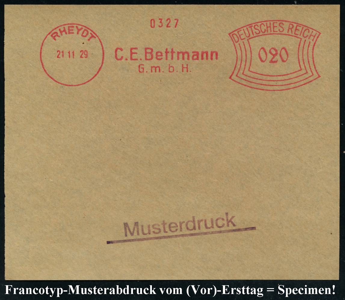 6765 | 35 € | 4070 Rheydt : RHEYDT/ C.E.Bettmann/ GmbH 1929 (27.11.) AFS-Musterabdruck Francotyp "Bogenrechteck" , glasklar gest. , kleines Francotyp-Musterblatt vom (Vor)-Ersttag !, selten! (Dü.E-1CEh, = frühe C-Maschine!) | ![]() ![]() | |