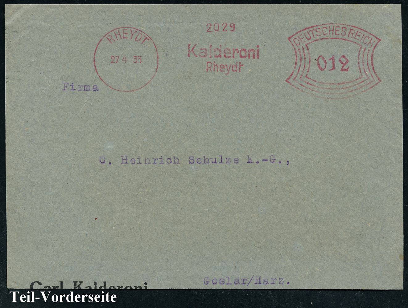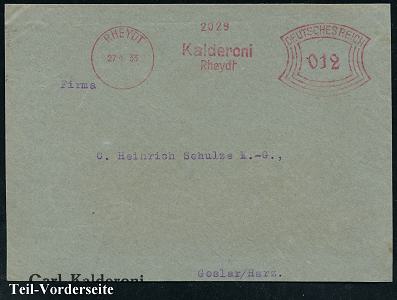 6767 | 14 € | 4070 Rheydt : RHEYDT/ Kalderoni.. 1933 (27.4.) AFS Francotyp "Bogenrechteck" , Bedarfs-Teil-Vorderseite (Dü.E-1CAh) | ![]() | |