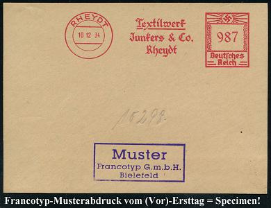 6769 | 35 € | 4070 Rheydt : RHEYDT/ Textilwerk/ Junkers & Co.. 1934 (10.12.) AFS-Musterabdruck Francotyp "Hakenkreuz" , glasklar gest. Francotyp-Musterblatt vom (Vor)-Ersttag + hs. Nr. der Maschine "10298", selten! (Dü.E-3CEo) | ![]() ![]() | |