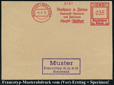 6772 | 35 € | 4070 Rheydt : RHEYDT-MÜLFORT/ Vierhaus & Zeime/ Baumwoll-Spinnerei/ u.Zwirnerei.. 1935 (14.5.) AFS-Musterabdruck Francotyp "Hakenkreuz" , glasklar gest. Francotyp-Musterblatt vom (Vor)-Ersttag !, selten! (Dü.E-3CEh) | ![]() ![]() | |