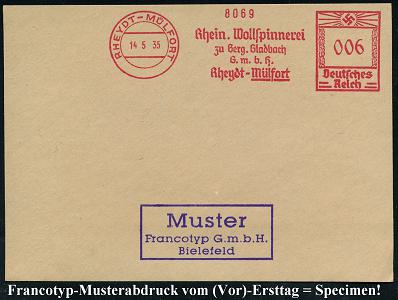 6773 | 35 € | 4070 Rheydt : RHEYDT-MÜLFORT/ Rhein.Wollspinnerei/ zu Berg.Gladbach/ GmbH.. 1935 (14.5.) AFS-Musterabdruck Francotyp "Hakenkreuz" , glasklar gest. Francotyp-Musterblatt vom (Vor)-Ersttag!, selten! (Dü.E-3CEh) | ![]() ![]() | |