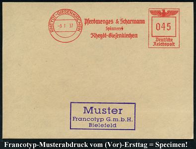 6778 | 35 € | 4070 Rheydt : RHEYDT-GIESENKIRCHEN/ Pferdmenges & Scharmann/ Spinnerei.. 1937 (8.1.) AFS-Musterabdruck Francotyp "Reichsadler" , glasklar gest. Francotyp-Musterabdruck vom (Vor)-Ersttag !, selten! (Dü.E-5CGo) | ![]() ![]() | |