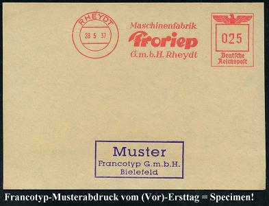 6779 | 35 € | 4070 Rheydt : RHEYDT/ Maschinenfabrik/ Froriep/ GmbH.. 1937 (28.5.) AFS-Musterabdruck Francotyp "Reichsadler" . glasklar gest. Francotyp-Musterblatt vom (Vor)-Ersttag!, selten! (Dü.E-5cgo) | ![]() ![]() | |
