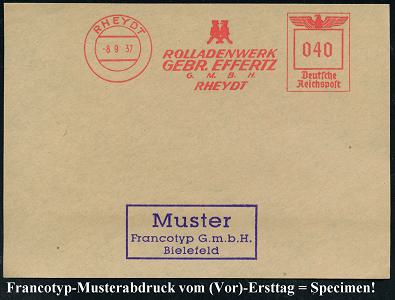 6780 | 35 € | 4070 Rheydt : RHEYDT/ ROLLADENWERK/ GEBR.EFFERTZ/ GMBH.. 1937 (8.9.) AFS-Musterabdruck Francotyp "Reichsadler" (Firmen-Logo) glasklar gest. Francotyp-Musterblatt vom (Vor)-Ersttag!, selten! (Dü.E-5CGo) | ![]() ![]() | |