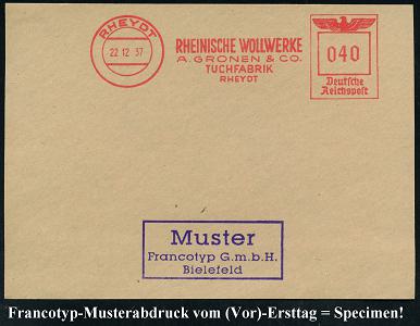 6783 | 35 € | 4070 Rheydt : RHEYDT/ RHEINISCHE WOLLWERKE/ A.GRONEN & CO./ TUCHFABRIK.. 1937 (22.12.) AFS-Musterabdruck Francotyp "Reichsadler" , glasklar gest. Francotyp-Musterblatt vom (Vor)-Ersttag !, selten! (Dü.E-5CGo) | ![]() ![]() | |