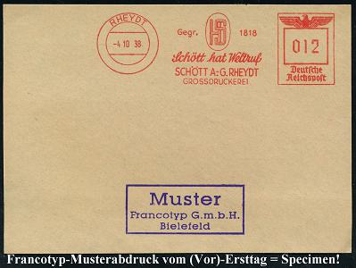 6785 | 35 € | 4070 Rheydt : RHEYDT/ Gegr.1818/ Schött hat Weltruf/ SCHÖTT AG../ GROSSDRUCKEREI 1938 (4.10.) AFS-Musterabdruck Francotyp "Reichsadler" (Monogr.-Logo) glasklar gest. Francotyp-Musterblatt vom (Vor)-Ersttag !, selten! (Dü.E-5CGo) | ![]() ![]() | |