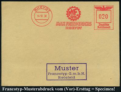 6786 | 35 € | 4070 Rheydt : RHEYDT/ MAX FRIEDERICHS.. 1938 (14.10.) AFS-Musterabdruck Francotyp "Reichsadler" (Zahnkranz-Logo) glasklar gest. Francotyp-Musterblatt vom (Vor)-Ersttag!, selten! (Dü.E-5CGo) | ![]() ![]() | |