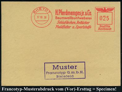 6787 | 35 € | 4070 Rheydt : RHEYDT/ H.Pferdmenges jr.& Co./ Baumwollbuntweberei/ Schlafdecken,Bettücher/ Plaidfutter u. Sportstoffe 1938 (17.10.) AFS-Musterabdruck Francotyp "Reichsadler" , glasklar gest. Francotyp-Musterblatt vom (Vor)-Ersttag !, selten! (Dü.E-5CGo) | ![]() ![]() | |