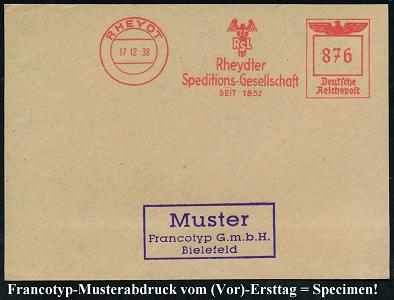 6788 | 35 € | 4070 Rheydt : RHEYDT/ Rheydter/ Speditions-Gesellschaft/ SEIT 1852 1938 (17.12.) AFS-Musterabdruck Francotyp "Reichsadler" (Firmen-Logo) glasklar gest. Francotyp-Musterblatt vom (Vor)-Ersttag!, selten! (Dü.E-5CGo) | ![]() ![]() | |