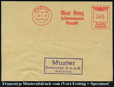 6789 | 35 € | 4070 Rheydt : RHEYDT/ Max Arnz/ Seidenwebereien.. 1939 (30.5.) AFS-Musterabdruck Francotyp "Reichsadler" , glasklar gest. Francotyp-Musterblatt vom (Vor)-Ersttag!, selten! (Dü.E-5CGo) | ![]() ![]() | |