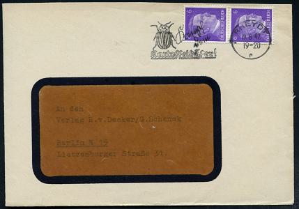 6792 | 18 € | 4070 Rheydt : RHEYDT/ *r*/ Kampf/ dem/ Kartoffelkäfer! 1942 (19.8.) Serien-MWSt, teils Sütterlin = Kartoffelkäfer , klar gest. Inl.-Firmen-Bf., rs. Abs.-HdN: Richard Everling, Kleiderfabrik (Bo.S 361 A = seltener Ort!) | ![]() | |