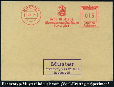 6791 | 35 € | 4070 Rheydt : RHEYDT/ Gebr.Müllers/ Eisenwarengroßhandlung.. 1939 (15.6.) AFS-Musterabdruck Francotyp "Reichsadler" (Firmen-Logo) glasklar gest. Francotyp-Musterblatt vom (Vor)-Ersttag!, selten!, vergl. Kat.Nr. 6740 (Dü.E-5CGo) | ![]() ![]() | |