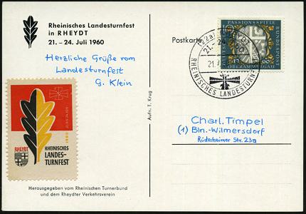 6796 | 20 € | 4070 Rheydt : (22a) RHEYDT/ 21.-24.7./ RHEIN. LANDESTURNFEST 1960 (22.7.) SSt auf s/w.-Sonder-Ak.: Rheinisches Turnbundfest mit Schloss Rheydt (= Michaelis unbekannt!) + offiz. Color-Turnfest-Vignette! (Eichenblatt) seltene Inl.-Karte n. West-Berlin (Bo.12) | ![]() ![]() | |