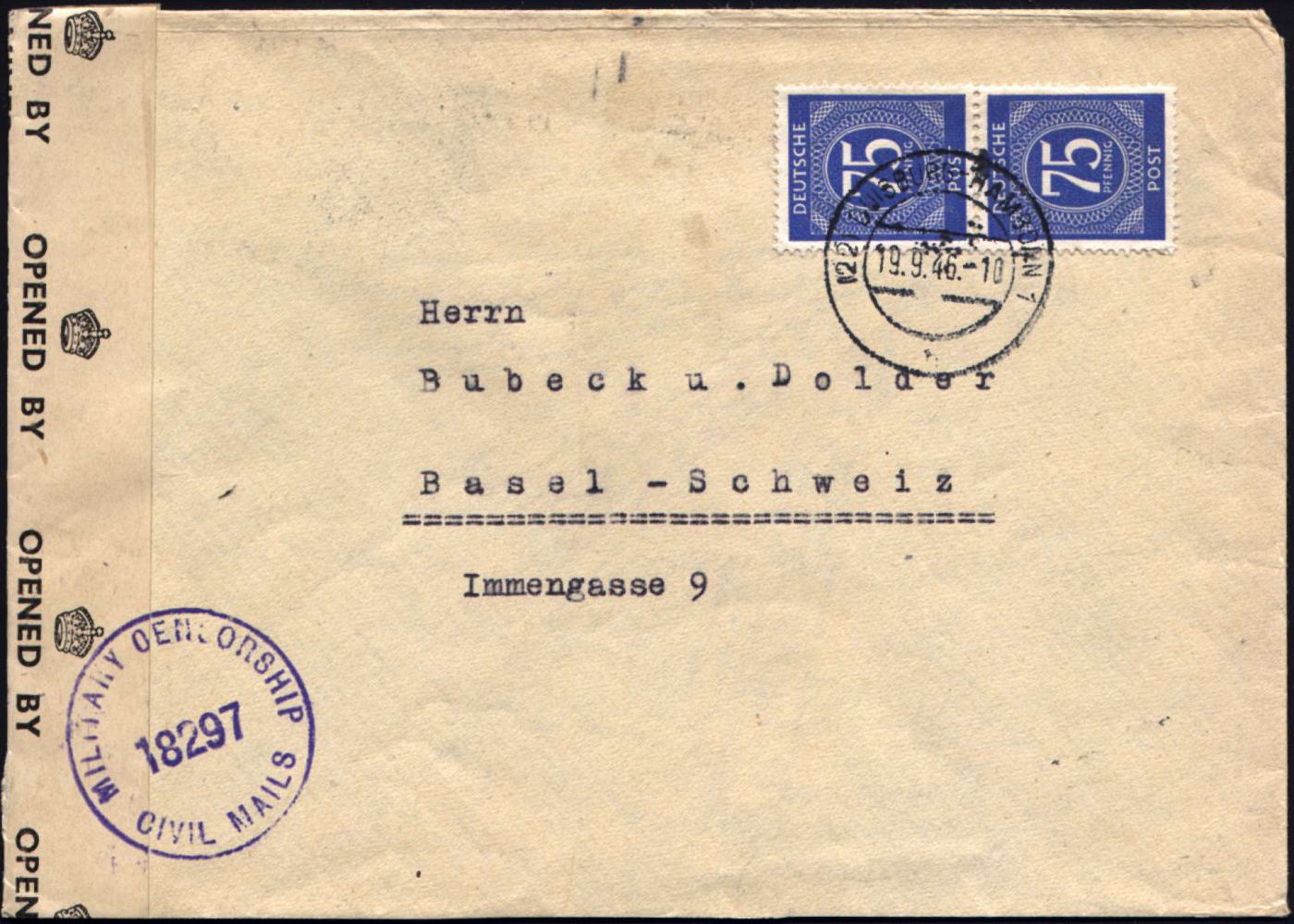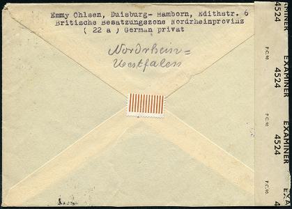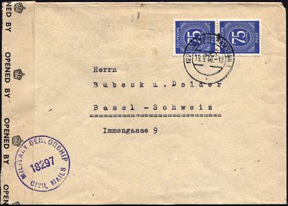6809 | 35 € | 4100 Duisburg allgem. Belege, Tagesstempel, Ganzsachen etc. : (22) DUISBURG-HAMBORN 1/ b 1946 (19.9.) 2KSteg auf Paar 75 Pf. Ziffer Kontrollrat (einige kurze Zähne) + brit. viol. Zensur-1K: 18297 + Zensurstreifen "4524" (= Bonn) klar gest. Ausl.-Bf., seltene Frankatur! (Mi.934, MeF, + 150.- MM) | ![]() ![]() | |
