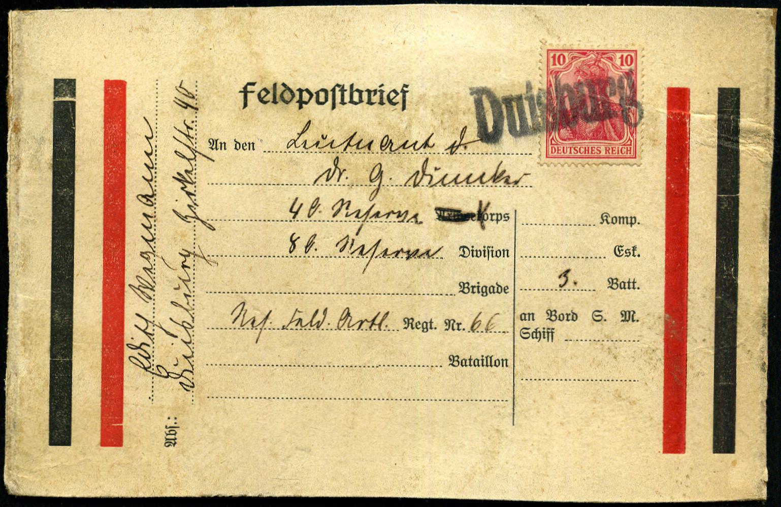 6800 | 35 € | 4100 Duisburg allgem. Belege, Tagesstempel, Ganzsachen etc. : Duisburg 1916 (ca.) schwarzer Päckchen-1L auf EF 10 Pf. Germania auf patriot. Feldpost-Päckchen-Adreßzettel an 80. Res.Div. in Felde, sehr dekorativ u. selten! (Mi.86 II EF) | ![]() | |