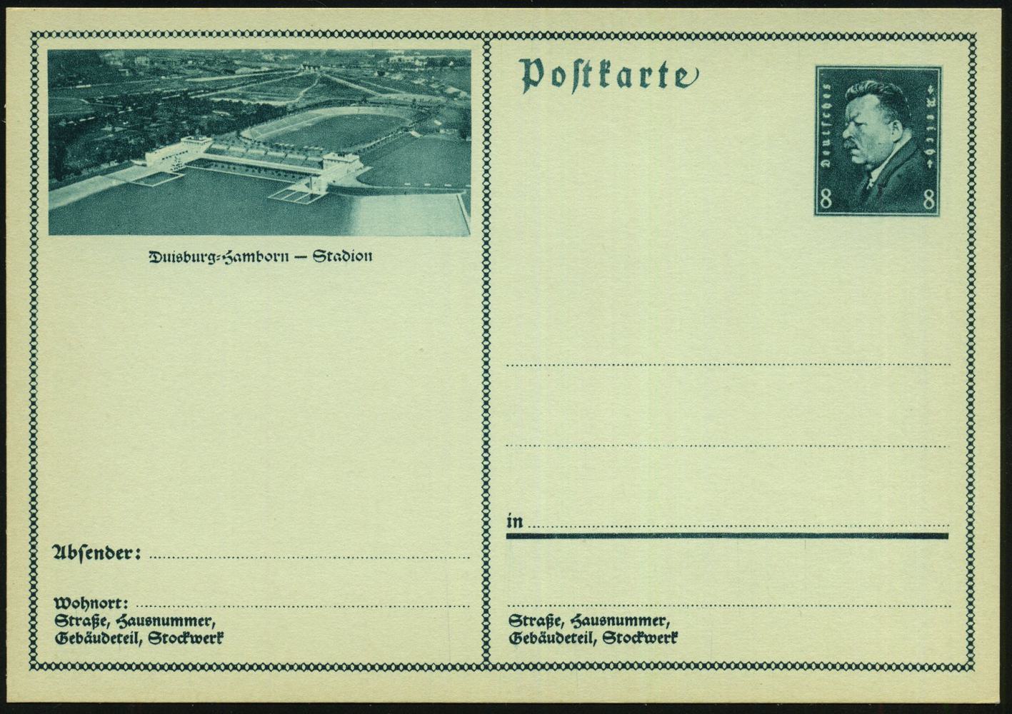 6802 | 10 € | 4100 Duisburg allgem. Belege, Tagesstempel, Ganzsachen etc. : Duisburg 1931 8 Pf. BiP Ebert, grün: Stadion Hamborn (Wasser-Stadion, Fußball, Athletik-Oval) ungebr. (Mi.P 191/04) | ![]() | |