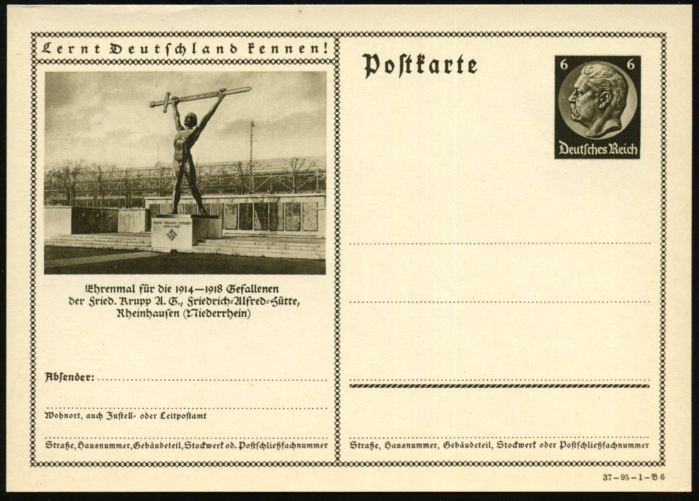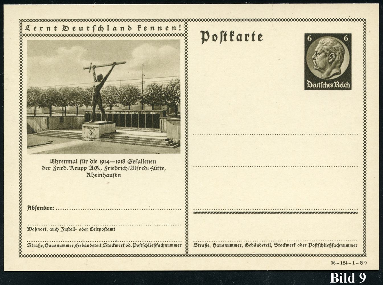 6806 | 8 € | 4100 Duisburg allgem. Belege, Tagesstempel, Ganzsachen etc. : Duisburg-Rheinhausen 1938 6 Pf. BiP Hindenbg., braun: Ehrenmal für die 1914 - 1918 Gefallenen d. Friedr. Krupp AG.. = Skulptur: Mann mit Schwert, ungebr. (Mi.P 236-38-124-1-B 9) | ![]() | |