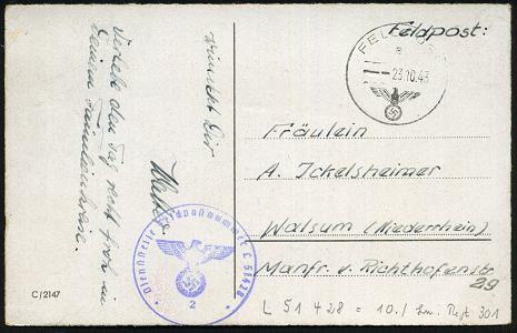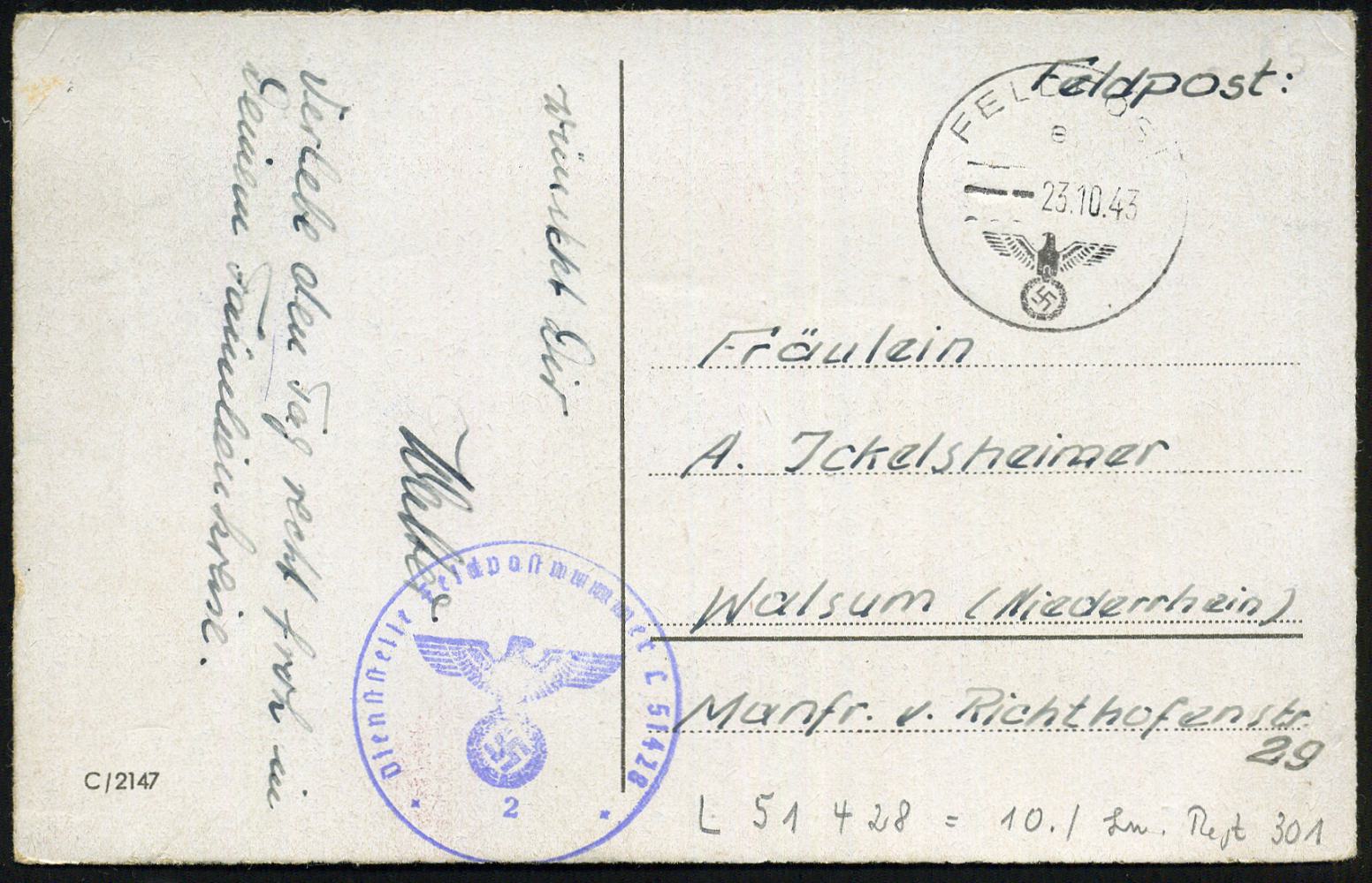 6808 | 12 € | 4100 Duisburg allgem. Belege, Tagesstempel, Ganzsachen etc. : Duisburg-Walsum 1943 (23.10.) 1K: FELDPOST/a/--- + viol. 1K-HdN: Feldpostnr. L 51 428 = Luftwaffen Rgt. 301 , Feldpost-Glückwunsch-Ak n. Walsum | ![]() | |