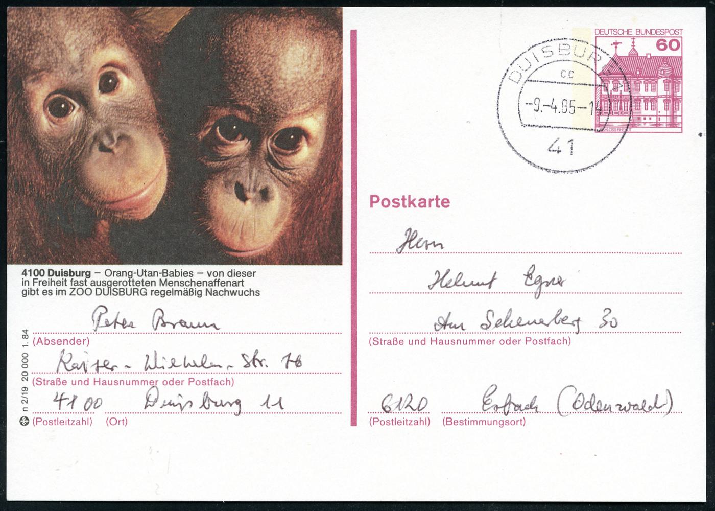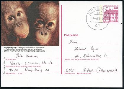 6811 | 14 € | 4100 Duisburg allgem. Belege, Tagesstempel, Ganzsachen etc. : 41 DUISBURG 1/ cc 1985 (9.4.) 1K-Segment auf ortsgl. BiP 60 Pf. Burgen: 4100 Duisburg - Oran-Utan-Babies.. (Mi.P 138) seltene Kombination! | ![]() | |