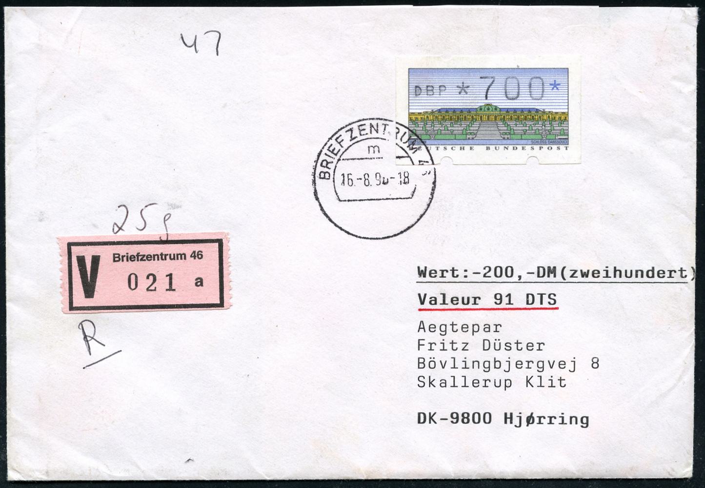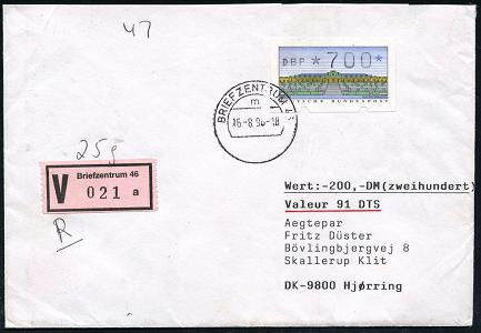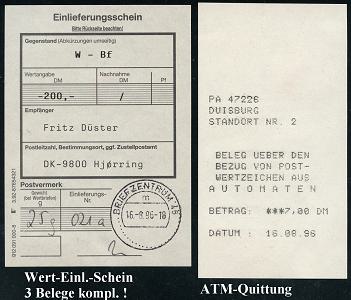6812 | 25 € | 4100 Duisburg allgem. Belege, Tagesstempel, Ganzsachen etc. : Duisburg 1996 (16.8.) 1K-Segment ohne PLZ: BRIEFZENTRUM 46/m auf EF 700 Pf. ATM. Sanssouci + rosa Wertzettel: Briefzentrum 46/a (= Duisburg) klar gest., gesiegelter Ausl.-Wertbf. 200.- DM (rs. Klappenriß) n. Dänemark + ATM-Quittung + Wert-Einl.-Schein, 3 Belege kompl.! (Mi.2) | ![]() ![]() | |