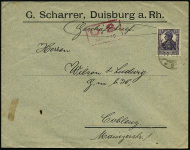 6801 | 18 € | 4100 Duisburg allgem. Belege, Tagesstempel, Ganzsachen etc. : Duisburg 2 1919 (1.7.) 15 Pf. Germania, viol., EF auf Firmen-Bf.: G. Scharrer.. + roter Zensur-Ra.2: U. S. / No. 272 (gering undeutl.) = US-Zensur = I. Rheinland-Besetzung (Wo.2) Inl.-Zensur-Bf. n. Koblenz (Mi.101) | ![]() | |