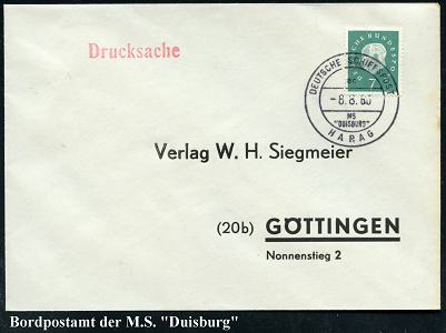 6813 | 30 € | 4100 Duisburg allgem. Belege, Tagesstempel, Ganzsachen etc. : B.R.D. 1960 (8.8.) 2K-Bordpostamt: DEUTSCHE SCHIFFSPOST/ac/MS/ "D U I S B U R G" /HAPAG , klar gest. Inl.-Drs.-Firmen-Bf. n. Göttingen, seltener Beleg! (St.Kat. Nr.i-11) | ![]() | |