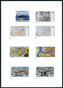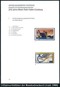 6814 | 20 € | 4100 Duisburg allgem. Belege, Tagesstempel, Ganzsachen etc. : B.R.D. 1991 (Juli) 100 Pf. "275 Jahre Rhein-Ruhr Hafen Duisburg", 18 verschied. Color-Entwürfe der Bundesdruckerei auf 3 Entwurfsblättern kompl., dabei Kran- u.Schiffs-, Landkarten-Motive, Aufl. nur 1000 (Mi.1558 u.a.) | ![]() ![]() ![]() | |